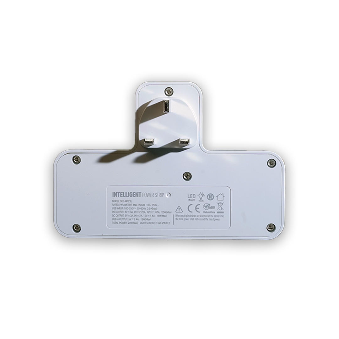 The SMART SEE-MP23L is a compact and versatile power solution designed to meet all your charging and power needs. Featuring 2 AC outlets and 4 USB ports (USB-C and USB-A), this portable extension power socket delivers fast charging with support for PD3.0 and QC3.0 protocols. With a total output of 2500W and 20W USB power, it’s perfect for powering household appliances, mobile devices, and more. The integrated touch-controlled night lamp adds convenience and functionality, making it ideal for home or travel use. Its universal design supports US, UK, and EU plugs, offering compatibility worldwide.